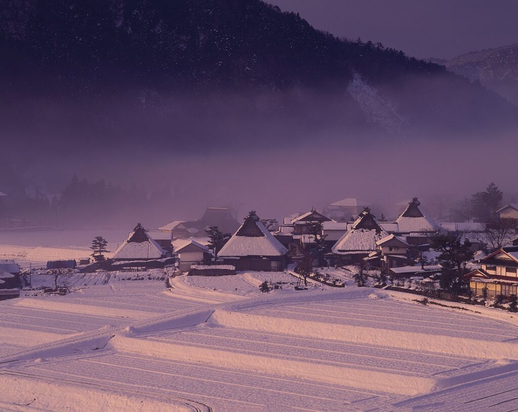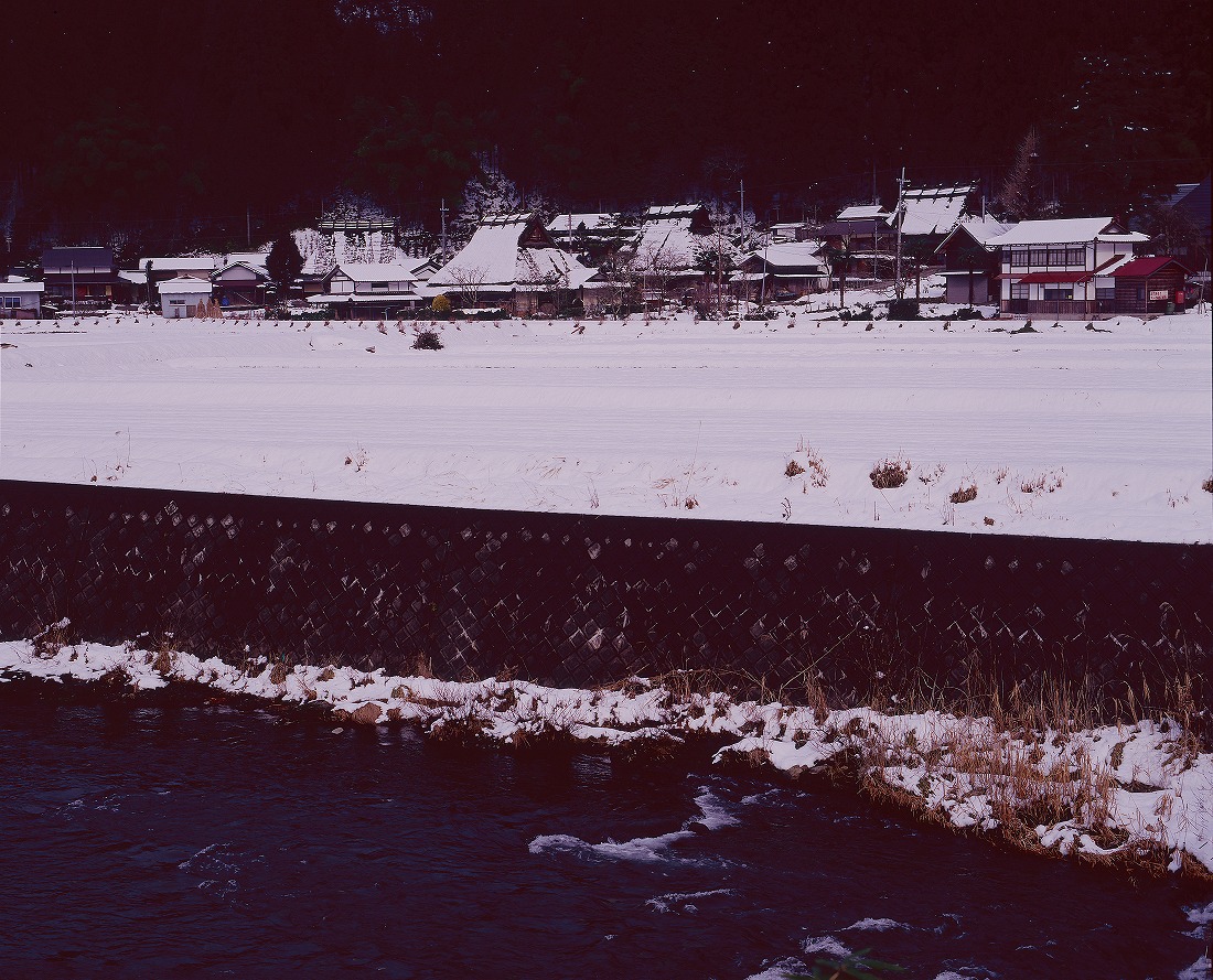 雪が降ると余分なものを全て隠してくれ、純白の世界が広がります。オレンジ色の斜光線をうけそこにたたずむ茅葺民家は神々しいほどです。天気予報で降雪状況を確認しては撮影に出かけました。最後の写真は美山で撮影したなかでも特に気に入っているものです。前夜、積雪があり、撮影場所に到着したときはもやがかかりどんよりした天気でしたが、撮影の準備中に雲の切れ間から朝陽が差し込み、その一瞬をとらえました。